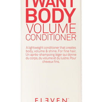 Eleven Australia I Want Body Volume Conditioner 300ml/10.1oz A lightweight conditioner for fine hair Packed with hydrolysed wheat & soy protein to add volume Formulated with avocado oil to condition hair Adds body & shine to hair Vegan-friendly