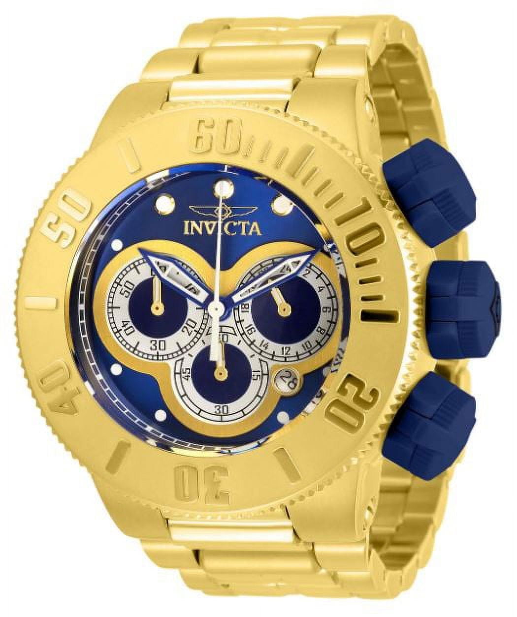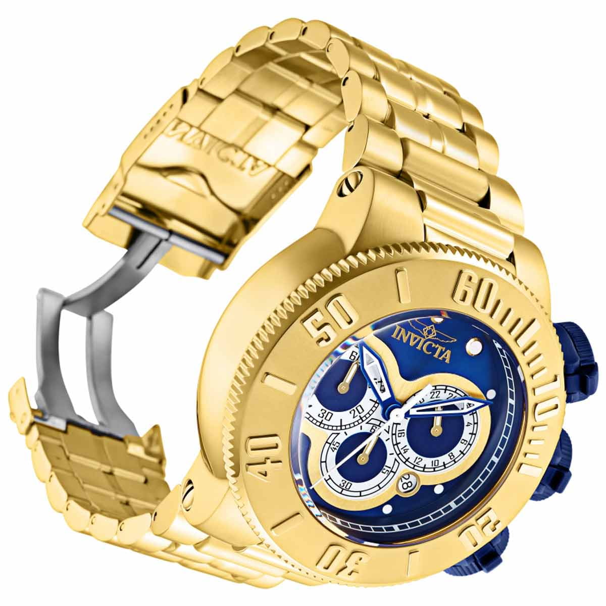 Invicta 31542 Specialty men's chronograph dive watch features a 52mm wide and 24mm thick yellow gold plated solid stainless steel case with a gold tone unidirectional rotating bezel and textured push-pull crown with function pushers. Invicta 31542 is powered by Japanese TMI VD53 quartz chronograph movement. This stylish watch also features a shiny blue, silver tone and gold tone dial with white accents blue luminous skeleton hands and dot hour markers along with the chronograph, 12/24-hour time and date display functions, scratch resistant mineral crystal and water resistant to 200 meters. Invicta 31542 is equipped with a 30mm wide yellow gold plated solid stainless steel bracelet with a fold over safety lock clasp. Invicta 31542 men's Specialty blue, silver and gold dial watch is brand new and comes in an original gift box and is backed by a 3 years limited warranty.