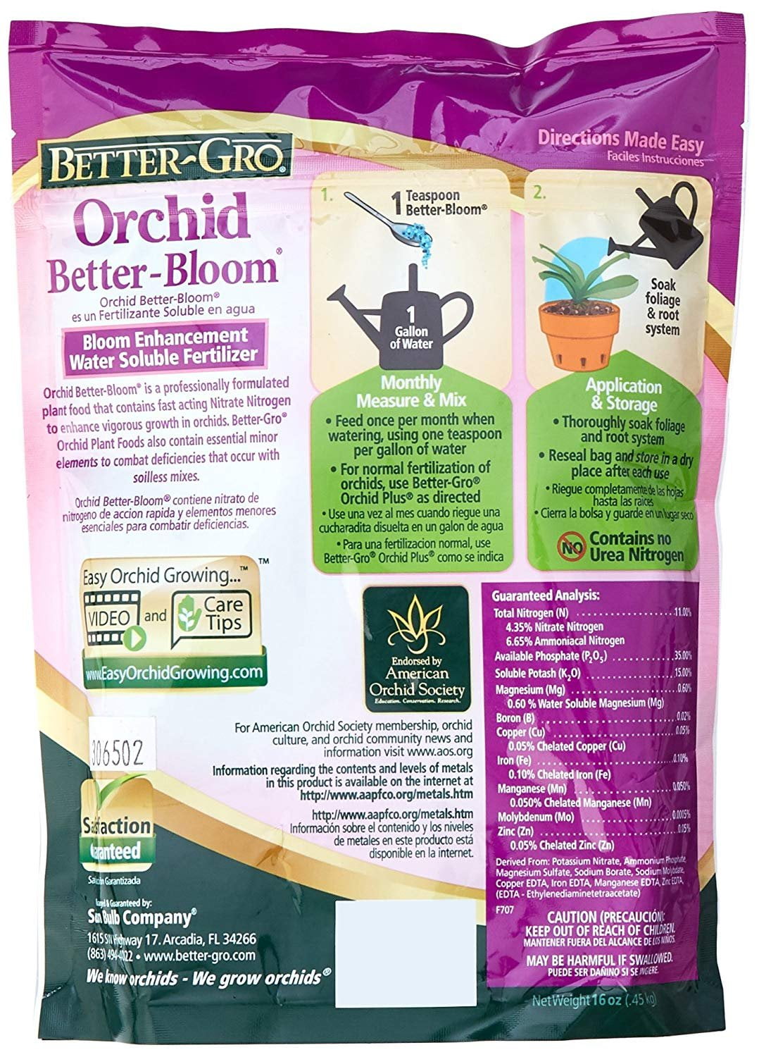 - Sun Bulb Orchid Better-Bloom plant food: Contains a high content of phosphorus used to encourage flowering, enhance bloom color, and maximize bloom size